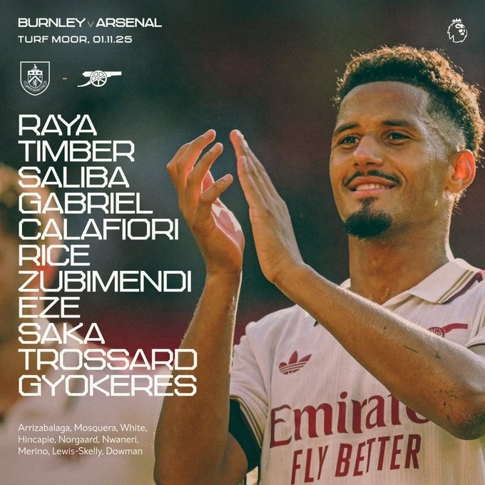 UTC+8时区11月1日23:00,英格兰足球超级联赛第10轮赛事持续展开,阿森纳足球俱乐部赴客场与伯恩利足球俱乐部展开对决,赛前双方首发球员名单已相继披露: